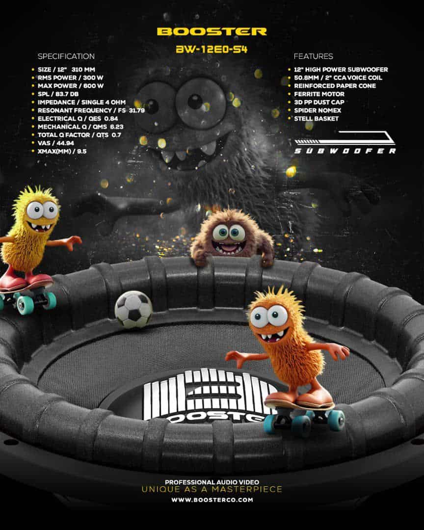 ساب ووفر ۱۲ اینچ بوستر BW-12E0-S4 سنگینترین ساب ووفر این شرکت به حساب می اید حال با این ساب ووفر بگفته شرکت بوستر حدود RMS 300 قدرت دارد.